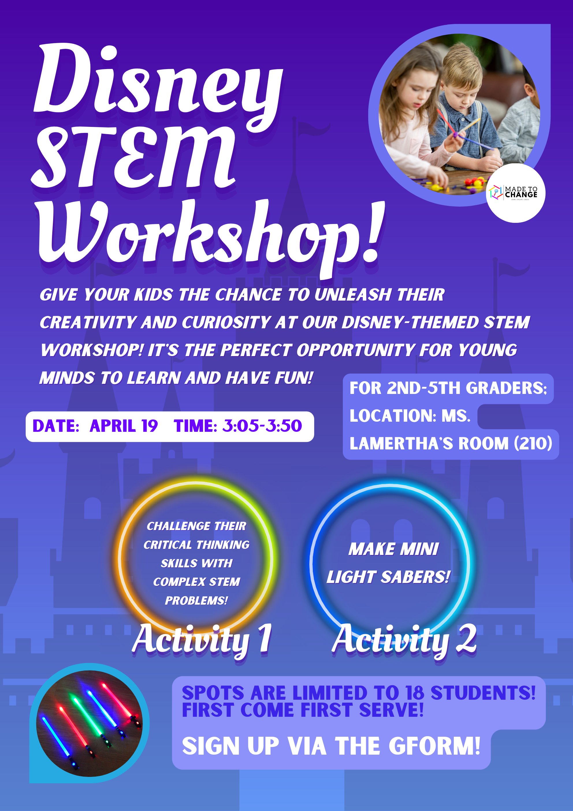 We are excited to announce our upcoming Disney-themed STEM workshop, hosted by Made to Change! It will be hosted on April 19 (Wednesday) from 3:05-3:50. This event is designed for 2nd to 5th graders and is the perfect opportunity for your child to explore their creativity and curiosity in a fun and engaging way.