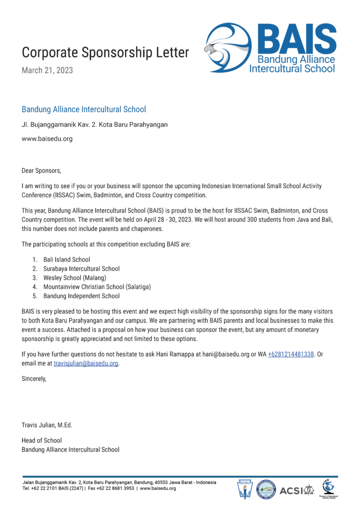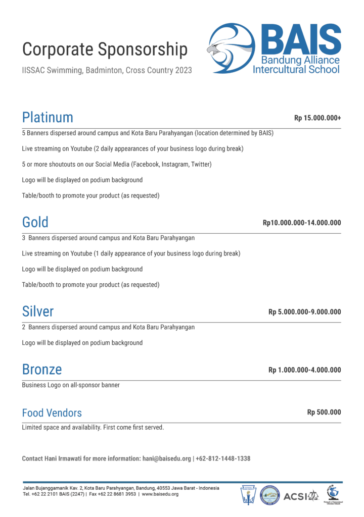Secondly, if you are able to sponsor this event, please see the letter below. Any amount of sponsorship will be helpful and appreciated so don’t hesitate to contact Hani Ramappa at hani@old.baisedu.org or WA +62 812 1448 1338 if you can help in this way.