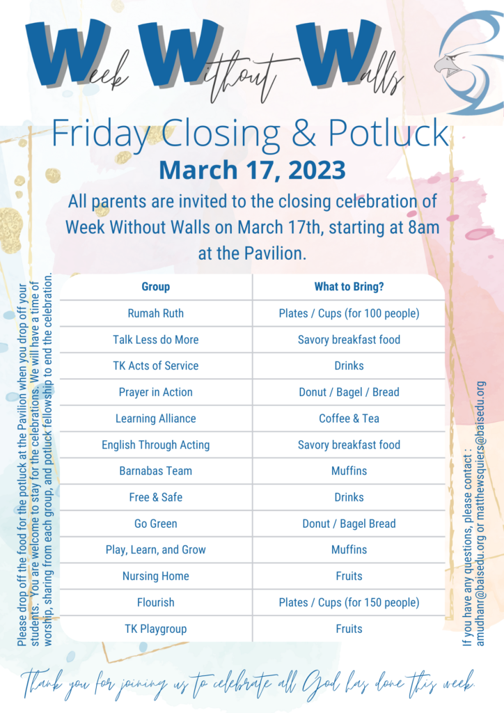 Transportation: A HUGE thank you to the parents who are generously donating their vehicles and drivers to BAIS during WWW! The final information should be emailed to you by the end of the day on Friday, so if you didn’t receive it, please check your spam and contact Ms. Ribbens (clarissaribbens@old.baisedu.org). Additionally, a hard copy will be sent home in today’s Friday Folders (elementary families) or on Monday (secondary families) Thanks so much!