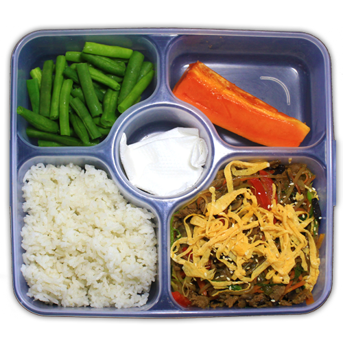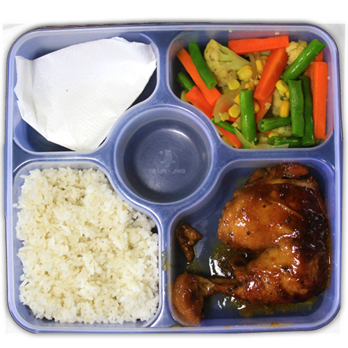 Served with String Bean, and/or carrots, white rice and fresh papaya.