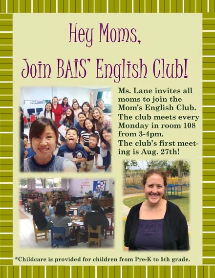 - Mom’s English Club is available for parents interested in improving their English skills.