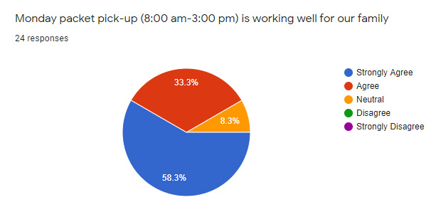- Monday packet pick-up is working well for families. We will continue with this procedure