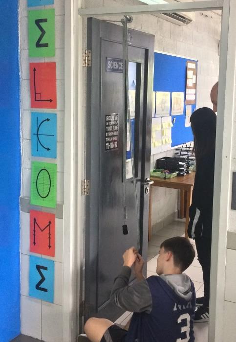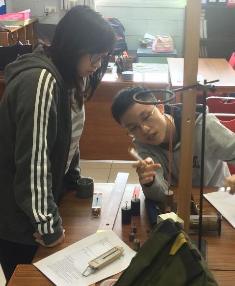 Daniel and Jane experimenting with different lengths of spring coils and weights to calculate measurements.
