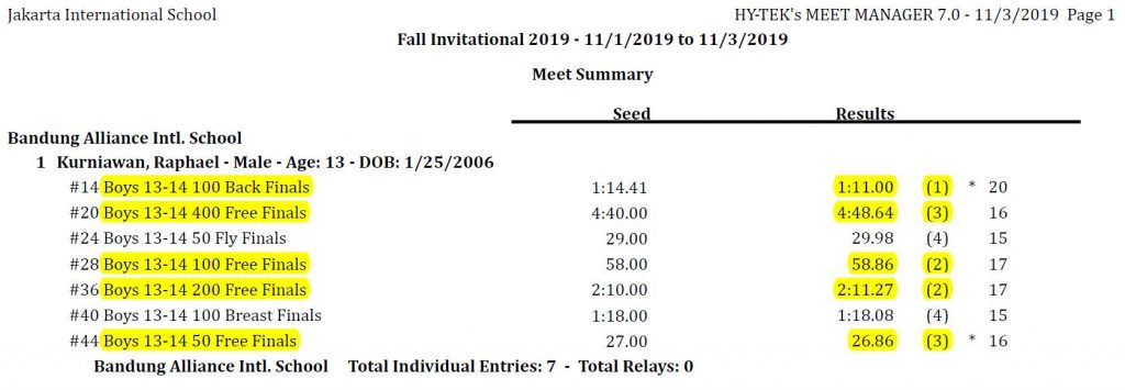 Congratulations, Raphael Kurniawan competed in the JIS Fall Invitational Swim Meet earlier this month (Nov. 1-3). He swam very well and won five medals in total: 1st place-1 medal, 2nd place-2 medals, and 3rd place-2 medals.