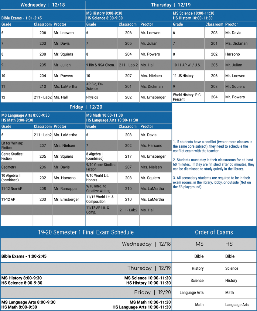 For attendance, all students will report directly to their exam rooms before 7:45. They will have a small amount of time to complete some final studying and the first exams of the day will officially start at 8:00.