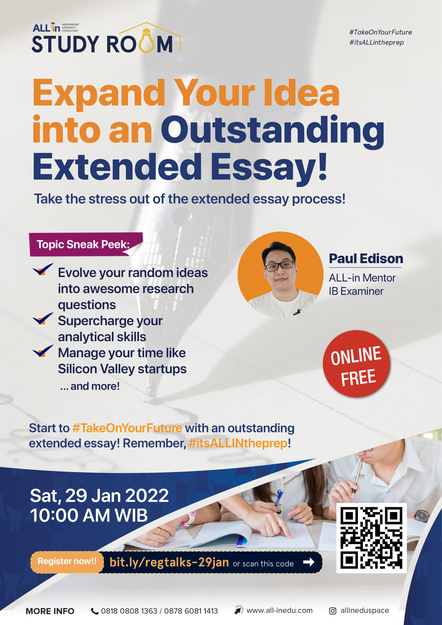 This week, ALL-in will expand your knowledge on writing an Extended Essay with the best person in the field. Paul Edison (ALL-in mentor, IB examiner) will give you the best tips and tricks to create the best Extended Essay!