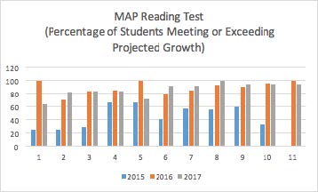 This chart reflects the percentage of students over the last three years who meet or exceed projected MAP growth in Reading. Growth is projected based on norms and the goals are created by the MAP program based on the millions of students who take the test. You will notice that the results in 2015 were relatively low compared to the last two years. This is an indication of the successful adjustments the English Language Arts department has implemented, some great new teaching strategies along with technology software that differentiates learning to provide a personalized instruction (IXL). We are pleased to celebrate students’ success in this area. You can see that 100% of the current 9th grade class met or exceeded their goals!