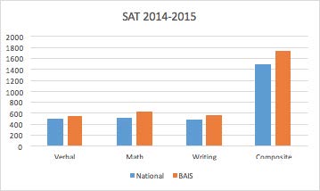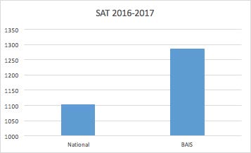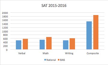 The three charts above show BAIS results on the SAT compared with the national averages. BAIS students consistently score over 200 points higher than the national averages on the SAT. Unfortunately, the new format of the SAT does not provide section results for comparison. We are hopeful CollegeBoard will soon be able to do so.