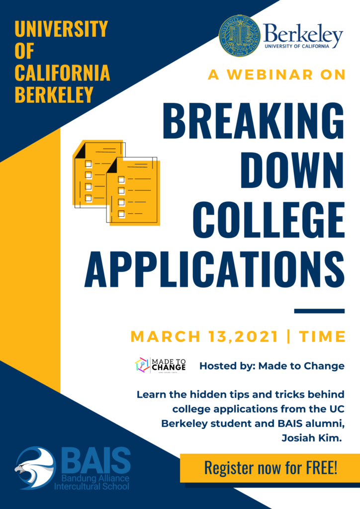 Made to Change is hosting another event for students from 6th-12th grade. This will be a special webinar with our guest speaker, Josiah Kim. Josiah, who is currently enrolled in UC Berkeley, will be teaching the different tips and tricks behind getting past the college admissions process. In our webinar: Breaking Down College, not only will students learn more about the college admissions process, we will also host a Q&A so you can ask your questions and discuss concerns about tests, college, and the admissions process in general. Sign up here to join our webinar on March 13 from 7-8pm.