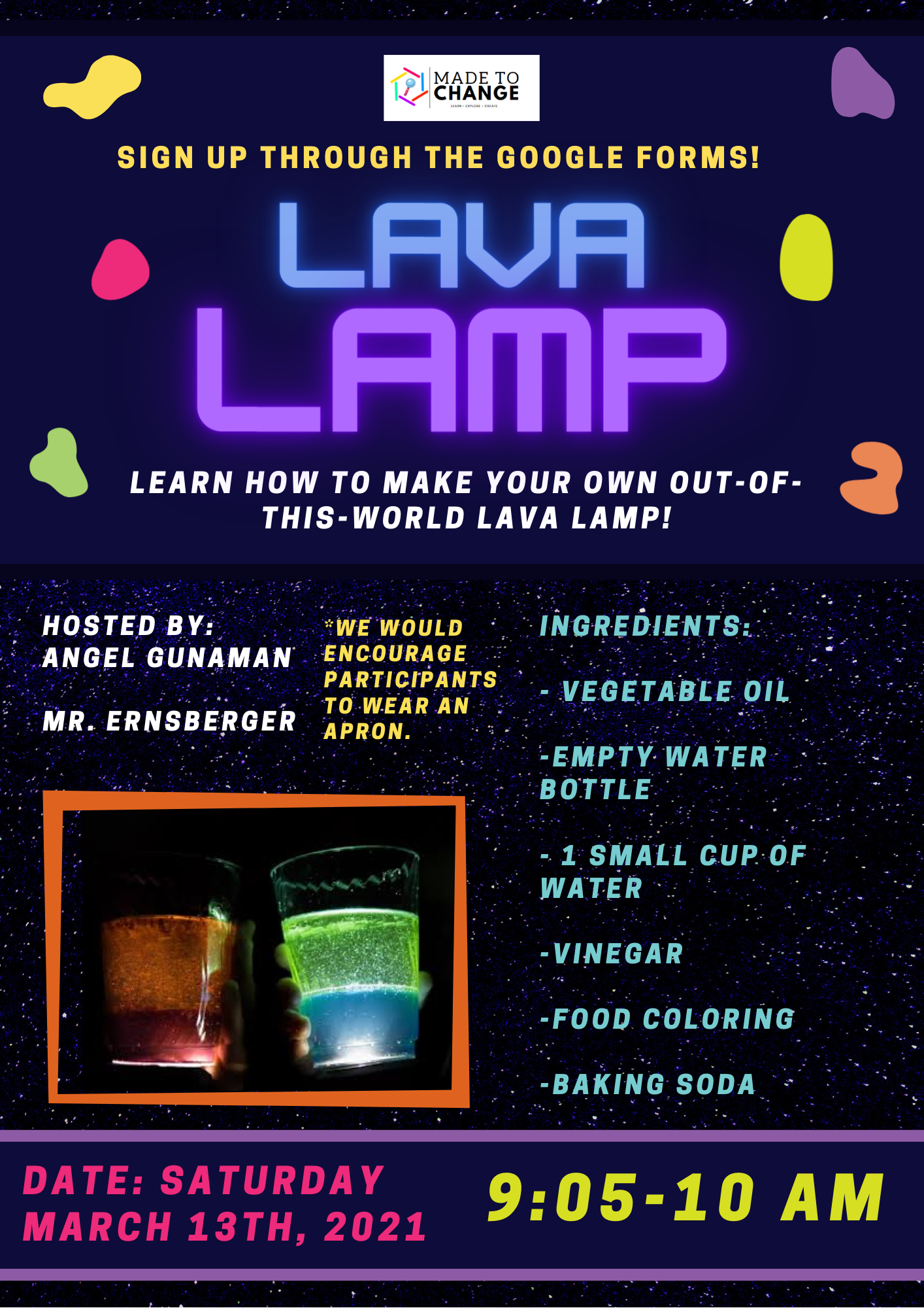 The Made to Change Club is back at it, and we’re hosting a new event! In this Zoom event, we’ll be making lava lamps. Come join us to learn about density and chemical reactions in a fun, exciting way! This event will be hosted by Mr. Karl Ernsberger and Angel Gunaman. To join, please sign up here.