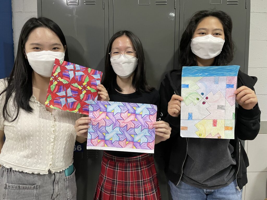 The 9th-grade Geometry class just completed a unit on transformations and symmetry. For their summative assessment students had the choice to take a written test or show their understanding of reflections, rotations, and symmetry by designing a tessellation art piece.